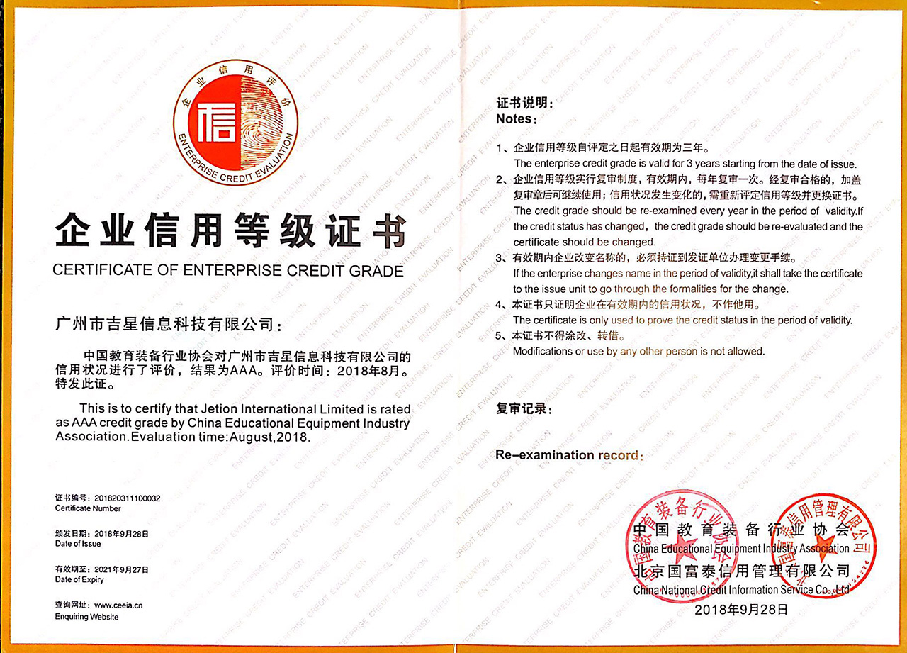 近日,中國教裝備行業(yè)協(xié)會和信用評價工作委員會聯(lián)合發(fā)布了“關(guān)于公布2018年中國教育裝備行業(yè)協(xié)會企業(yè)信用等級評價結(jié)果的通知”(教信評文【2018】4號文件),經(jīng)地方協(xié)會預(yù)審、推薦,最終確定參評企業(yè)僅有405家獲得評級資格,其中,只有46家企業(yè)獲得AAA級企業(yè)信用等級證書,包括有四川長虹教育、北京育靈童等,吉星集團(tuán)此次獲得AAA高信用評級榮譽(yù)稱號,無疑是教育裝備協(xié)會和專業(yè)機(jī)構(gòu)對公司經(jīng)營能力和信用水平的最高認(rèn)可。