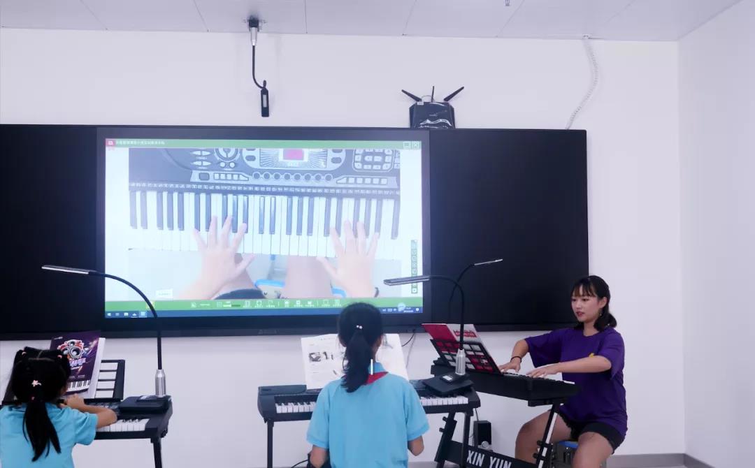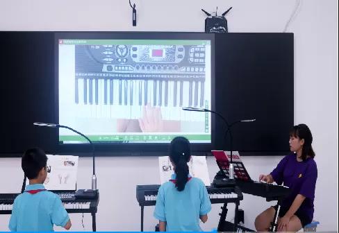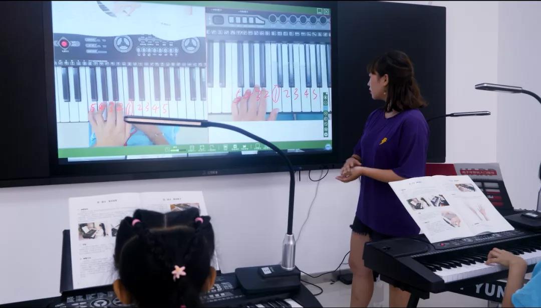 老師通過互動終端,將自己的彈奏示范操作大屏幕展示,每個學(xué)生可以即時地看到老師的彈奏過程、手臂動作等細節(jié),直觀地掌握課程要點。