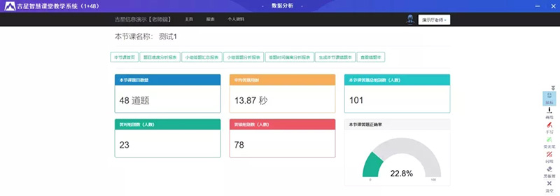 吉星強交互智慧課堂結合大數據分析,自動收集學生課堂測驗的數據,并形成一系列不同方面數據報表,幫助教師分析全體學生的學習情況,針對各學生的薄弱情況進行重點教學。