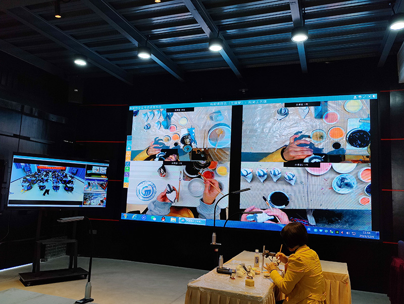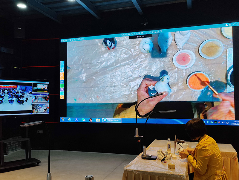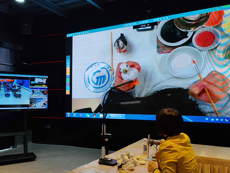 在上課過(guò)程,教師調(diào)取學(xué)生對(duì)陶瓷的上色過(guò)程,通過(guò)設(shè)備,教師能夠看到學(xué)生的細(xì)微操作,及時(shí)作出指導(dǎo)和修正,幫助學(xué)生更好掌握傳統(tǒng)技藝。而學(xué)生也可以及時(shí)提問(wèn),解決在技藝學(xué)習(xí)中的疑問(wèn)。