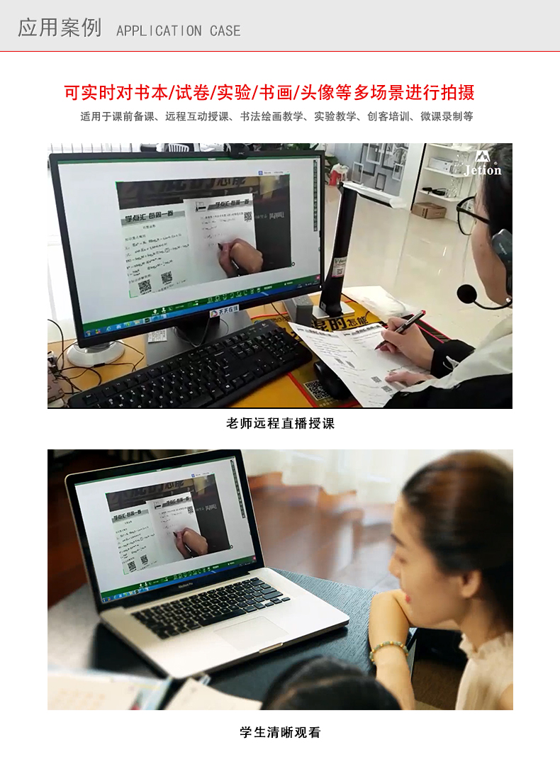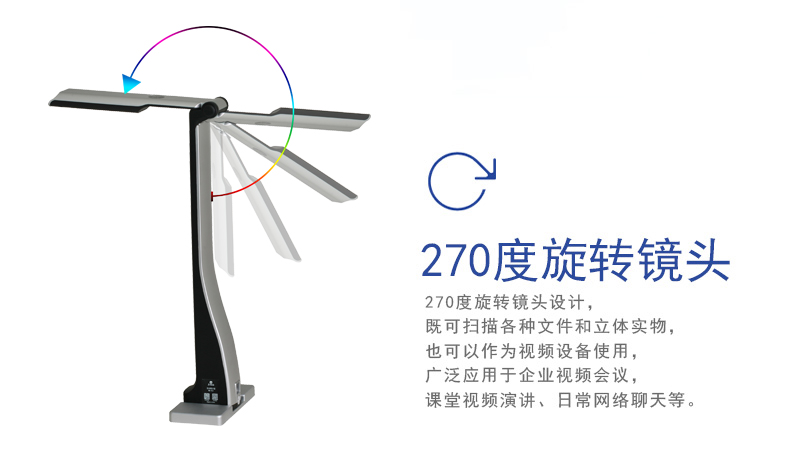 機械折臂270度翻轉式:90度可拍攝文稿;180度可拍攝課堂活動,用作簡易的錄播系統;270度可錄制微課